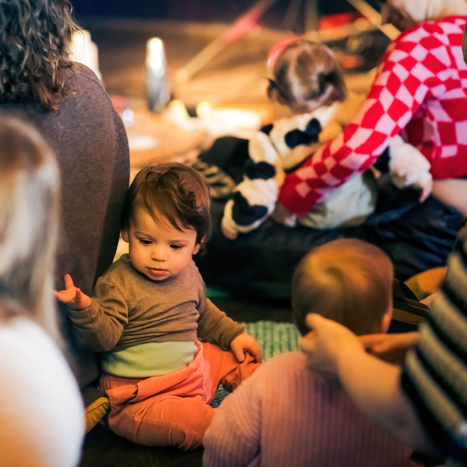 Prior to the performance, we take audiences through a restorative optional movement session as a moment for them to arrive in the space, connect with their babies and also perform movements that they often do in isolation at home with others experiencing similar things to them.